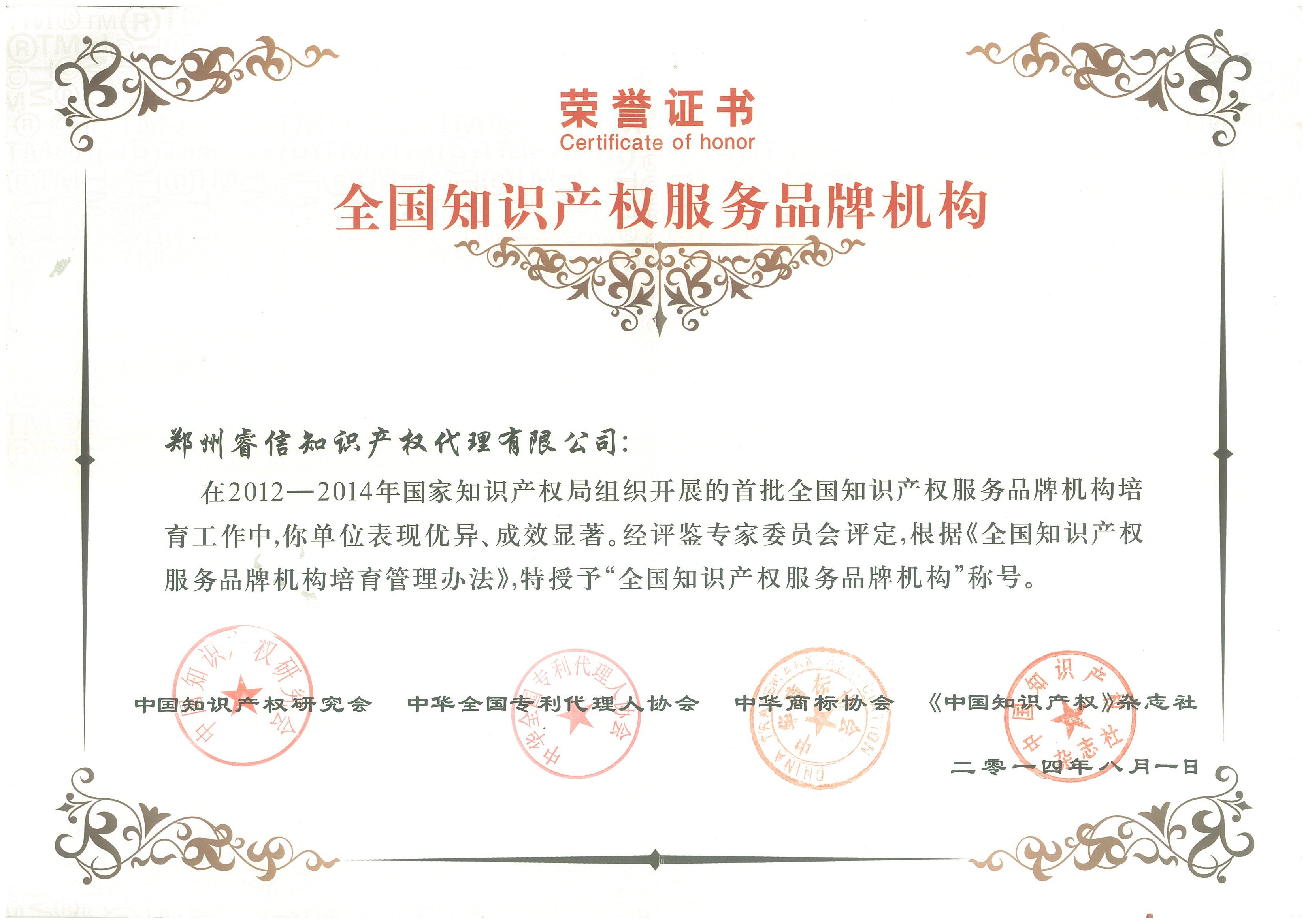 2014年8月1日公司被授予“全國知識產(chǎn)權(quán)服務(wù)品牌機(jī)構(gòu)”稱號。