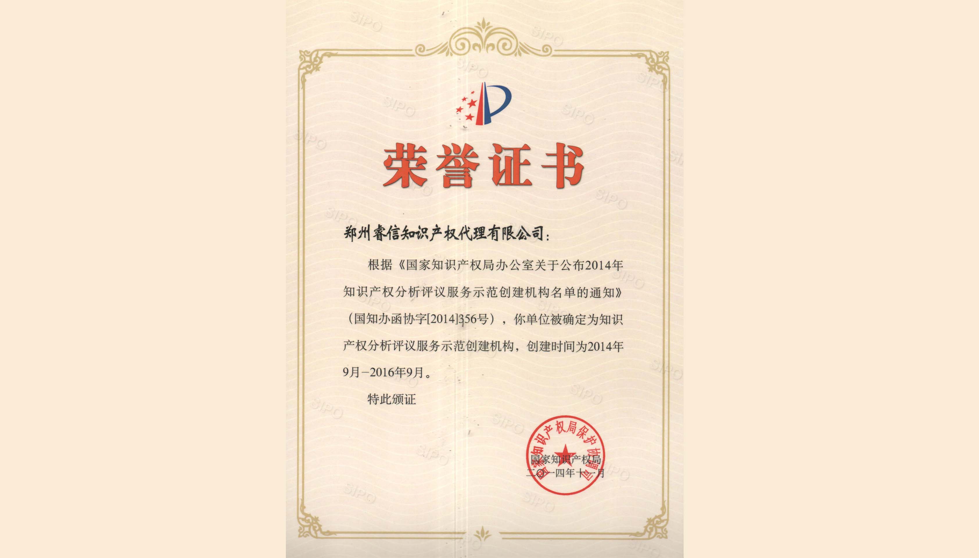 2014年11月公司被國家知識產(chǎn)權(quán)局確定為“知識產(chǎn)權(quán)分析評議服務(wù)示范創(chuàng)建機(jī)構(gòu)”。